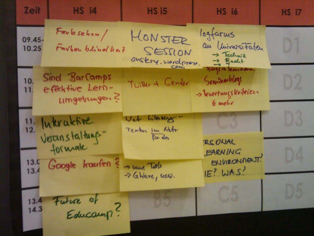 Ein Barcamp hat ja zuerst einmal keinen solchen. Nach den Eröffnungsworten von Martin Ebner (TU Graz und Organisator – mit vielen Helfern) melden sich die Leute, die eine Session veranstalten wollen. Das kann schon im Vorfeld in einem Wiki erfolgen, diesmal fand es live statt. Die InitiatorInnen stellten kurz ihr Thema vor, fragte, ob Interesse bestehe und klebten ihr PostIt auf einen freien „Slot“. Der Samstag war schnell verplant, der Sonntag enstand in der Folge.