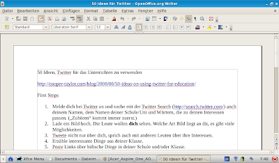 Ich besitze seit Herbst ein Netbook, den Acer Aspire 110 und ich liebe es! Ich habe mich absichtlich für die günstigste Variante mit Flash-Speicher und Linpus Linux entschieden, weil ich ein keinen zweiten Laptop wollte, sondern ein Gerät, das für die Verwendung von Internet- und/oder Web 2.0-Tools sein sollte. Diese Aufgabe erfüllt mein „Kleiner“ voll und ganz. In 15 Sekunden fährt er hoch, in 30 bin ich online (WLAN oder UMTS-Modem).